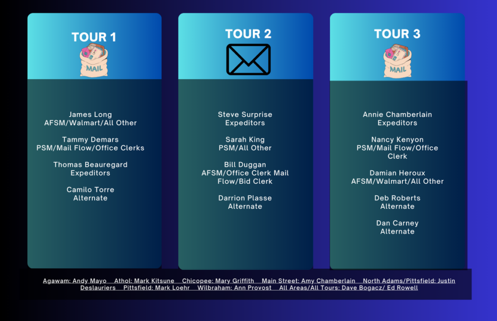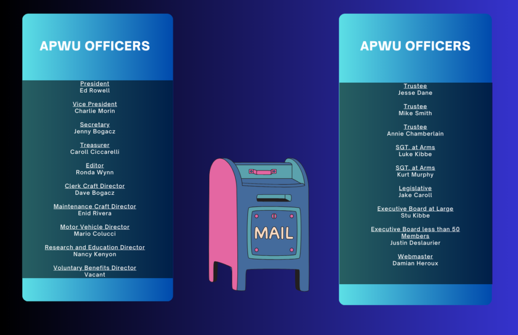 Welcome to the Springfield Massachusetts Area Local 497 of the American Postal Workers Union. We represent approximately 750 employees in the western Massachusetts area. We represent a diverse workforce consisting of the clerk, maintenance, vehicle services and support services crafts. Our members work in facilities ranging from a very large processing plant located in Springfield to small area offices located in individual towns. They process mail, repair equipment related to postal operations and transport mail to and from postal facilities from western Mass. to Rhode Island to New Jersey.